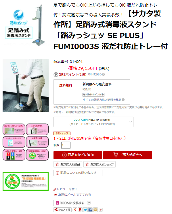 2021.01.20 製品情報 足踏み式消毒液スタンド「踏みっシュッ」が楽天でも購入できるようになりました! 足踏み式消毒液スタンド「踏みっシュッ」は今まで通販だとアマゾンで購入ができたのですが、 この度楽天でも購入できるようになりました! [maxbutton id=”71″ ] 購入を考えている方は是非ご利用ください! お知らせ一覧に戻る
