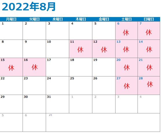 8月の休業カレンダーを掲載いたします。