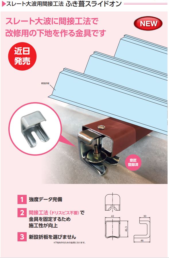 スライドオンはスレート大波屋根用の改修金具でこちらも間接工法が特長です。昨年末頃のカタログでは「近日発売」と記載しておりましたが、こちらも発売しております。資料はこちら↓↓。