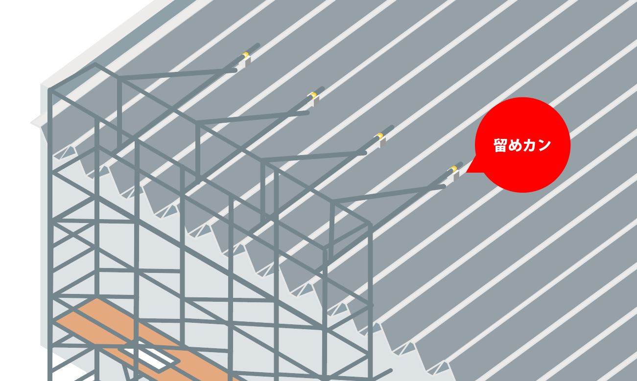 留めカンを使ってハゼ式折板屋根に固定