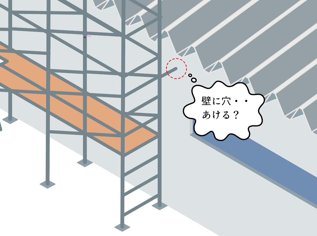 方法としては壁にアンカーを打ち、「壁つなぎ」を使って足場を固定する、といった方法です。