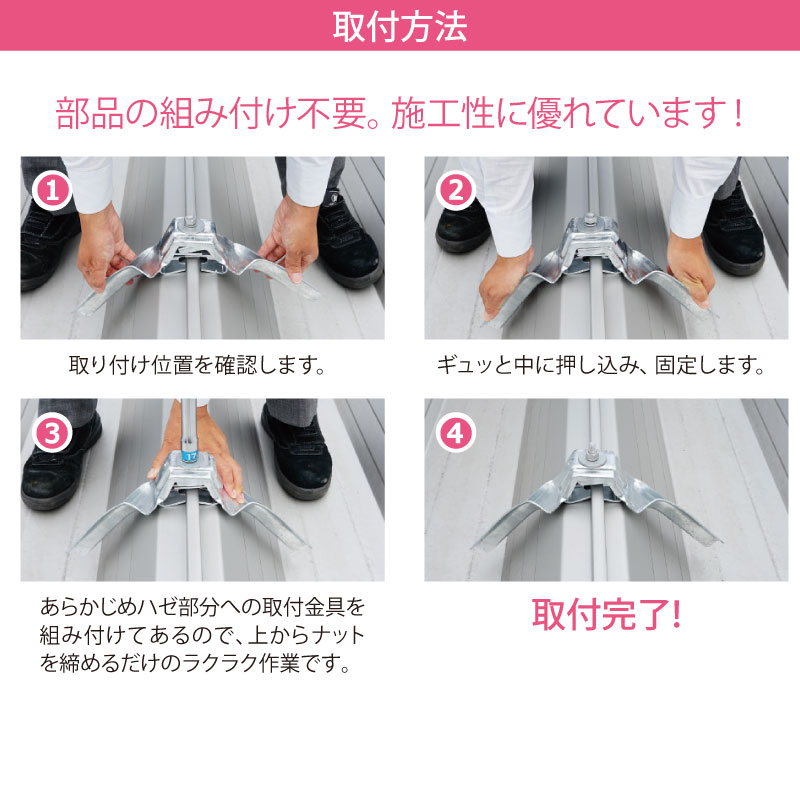 ハゼ式折板用雪止金具。折板谷部分の雪もガードします。