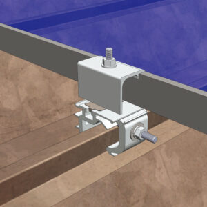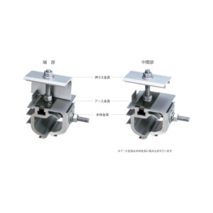 「丸ハゼ式折板屋根」のハゼ(接合部)を挟み、屋根に穴を開けずに太陽光パネルを設置するための専用の取付金具です。
